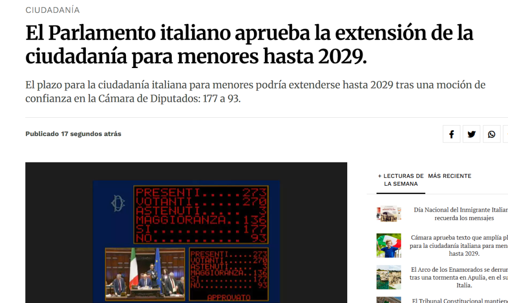 La Cámara de Diputados italiana aprobó la extensión del plazo para que los padres declaren su intención de ejercer el beneficio de la ciudadanía italiana para sus hijos menores. El nuevo límite se fija en el 31 de mayo de 2029, lo que otorga cuatro años adicionales frente al calendario original.