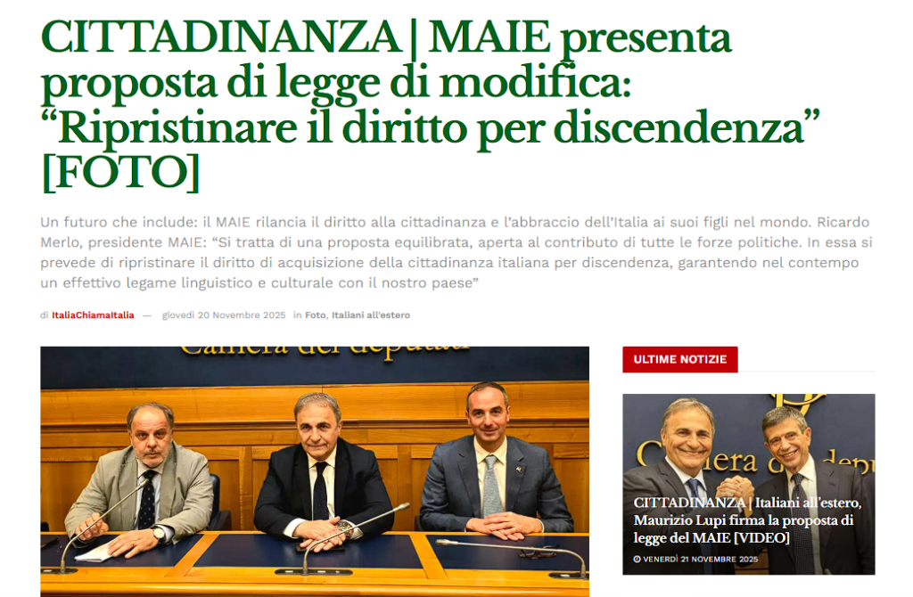 El MAIE (Movimento Associativo Italiani all’Estero) presentó en noviembre de 2025 un proyecto de ley que busca restaurar el derecho a la ciudadanía italiana por descendencia, un tema central para millones de italianos en el mundo. La iniciativa, impulsada por Ricardo Merlo junto a Mario Borghese y Franco Tirelli, propone que hijos y nietos de italianos accedan automáticamente a la ciudadanía, mientras que para bisnietos y generaciones posteriores se exige un certificado de lengua y cultura italiana que garantice un vínculo efectivo con el país.