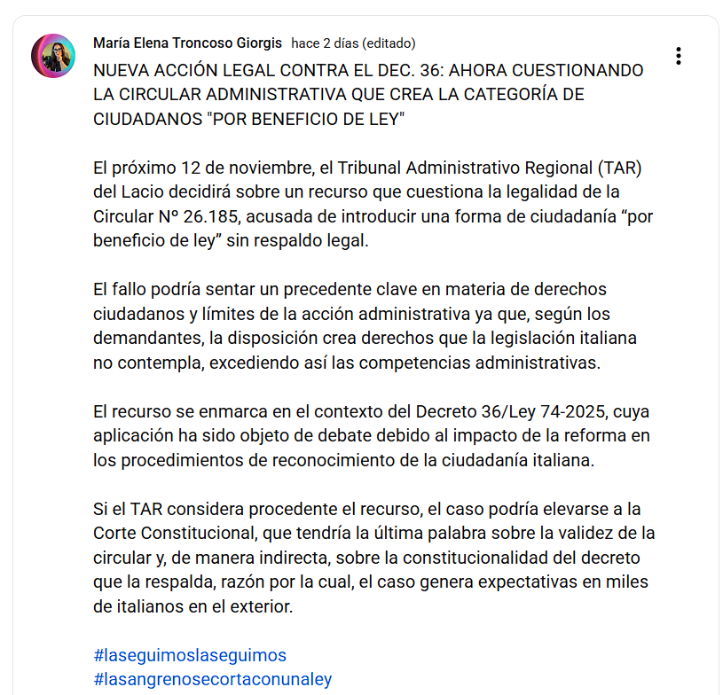 El 12 de noviembre de 2025, el Tribunal Administrativo Regional (TAR) del Lacio evaluará un recurso clave que cuestiona la legalidad de la Circular 26.185, acusada de crear una categoría de ciudadanía “por beneficio de ley” sin base legislativa.